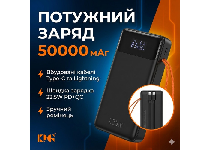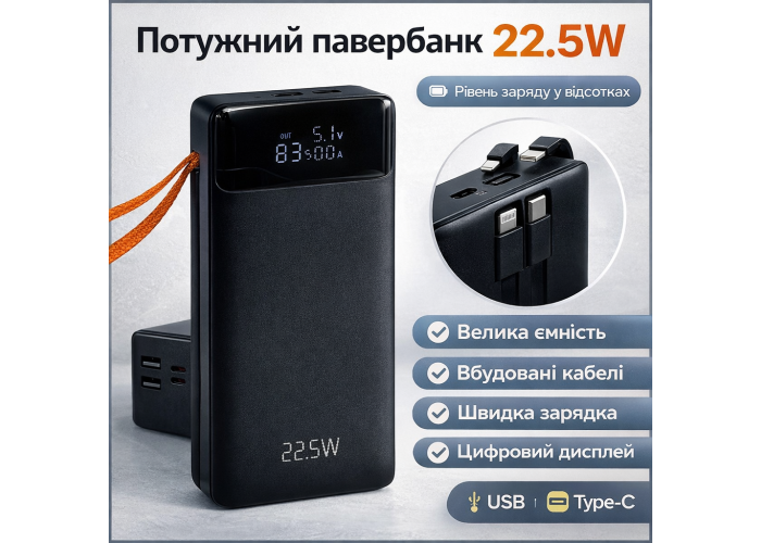 Велика місткість 50000 mAh дає змогу багаторазово заряджати мобільні пристрої, а підтримка швидкого заряджання до 22.5 Вт неабияк скорочує час відновлення енергії. Зручний LED-індикатор показує поточний рівень заряду, допомагаючи контролювати залишок енергії.