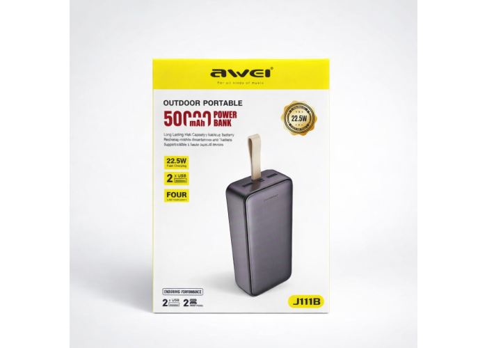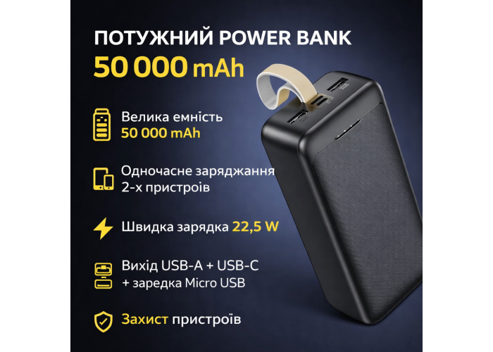 Повербанк J111B — це потужний та надійний зовнішній акумулятор ємністю 50000 mAh, створений для тривалого автономного живлення смартфонів, планшетів, навушників, смартгодинників та інших електронних пристроїв. Завдяки підтримці швидкої зарядки 22.5W він забезпечує ефективне та швидке відновлення енергії навіть при одночасному підключенні декількох девайсів.