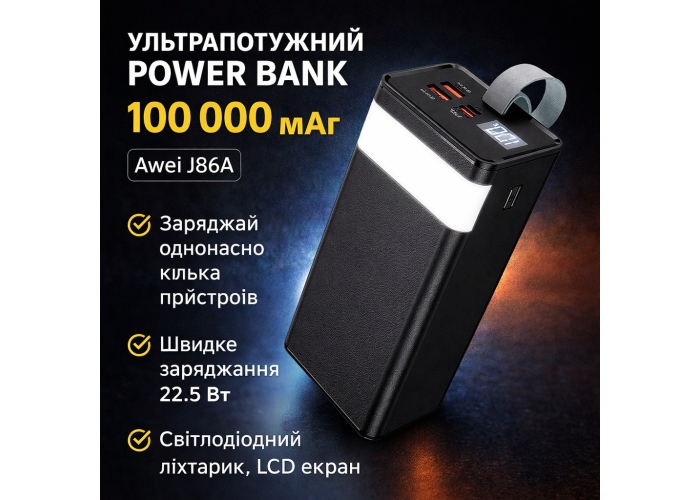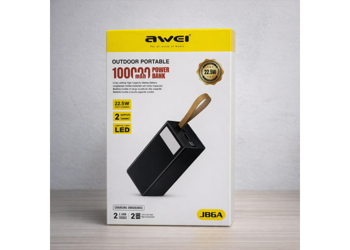 Опис Ультрапотужний Power Bank Awei J86A з рекордною ємністю 100000 mAh — це надійне джерело енергії для тривалих поїздок, роботи в польових умовах або на випадок, якщо немає електрики. Пристрій може багаторазово заряджати смартфони, планшети та інші ґаджети. Модель обладнана кількома портами, що дає змогу під'єднувати кілька девайсів одночасно. Інтелектуальна система розподілу струму підбирає оптимальні параметри для безпечного заряджання кожного пристрою. Вбудований цифровий LED-дисплей інформує про поточний рівень заряду акумулятора. Корпус виготовлений із міцних, зносостійких матеріалів.