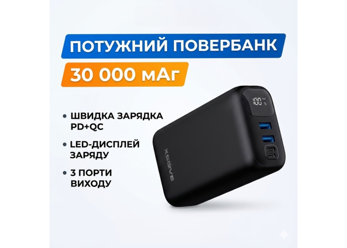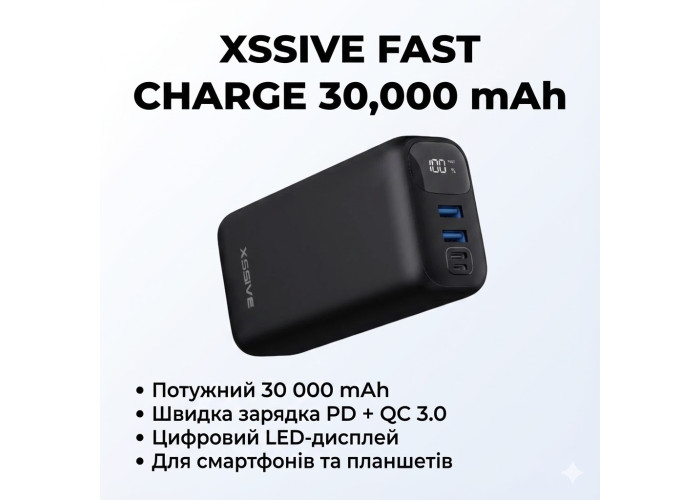 Потужний зовнішній акумулятор XSSIVE XSS-PB23 ємністю 30 000 мА·год — це універсальне рішення для заряджання ваших ґаджетів далеко від розеток. Пристрій підтримує сучасні протоколи швидкого заряджання, що дає змогу оперативно відновити енергію смартфона, планшета або інших сумісних девайсів, економлячи ваш час. Компактний корпус із міцних матеріалів та інформативний дисплей роблять використання повербанка максимально зручним і безпечним у будь-яких умовах