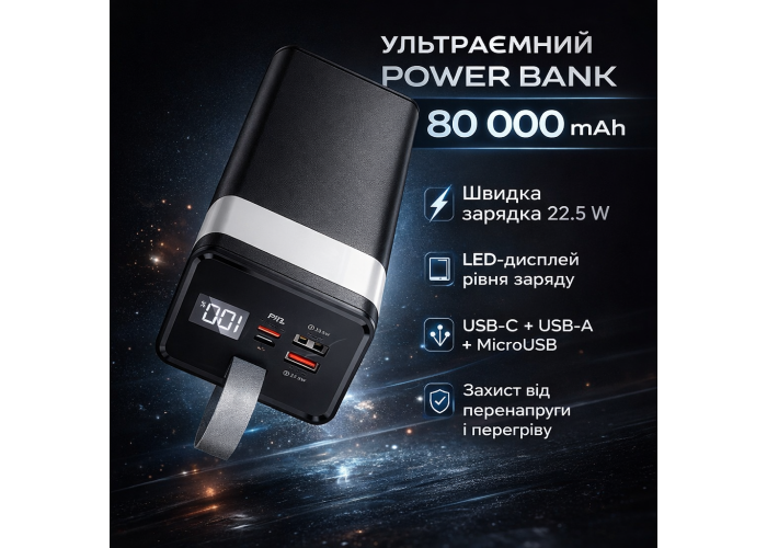 Дуже велика ємність — 80000 mAh, забезпечує багаторазову зарядку портативних пристроїв.