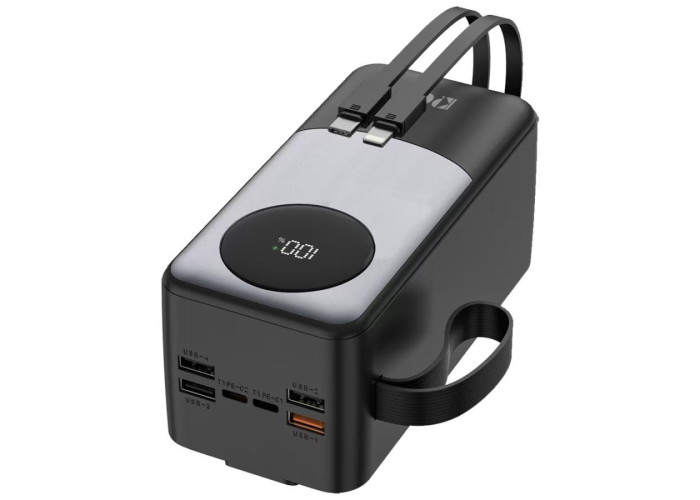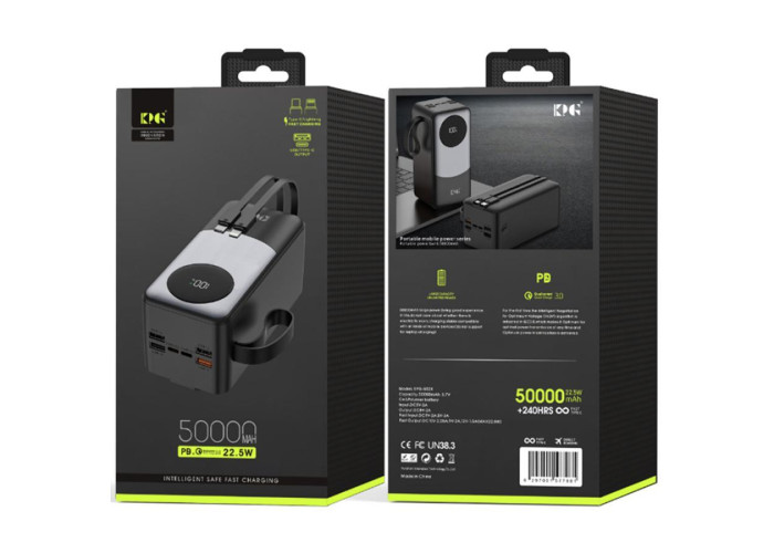 Опис Зовнішній акумулятор KPG KPG-502X — це високий портативний зарядний пристрій на 50 000 мА·год, створений для забезпечення тривалої автономності ваших мобільних девайсів. Модель обладнана вбудованими кабелями та декількома вихідними портами, що дає змогу заряджати кілька ґаджетів одночасно без потреби пошуку додаткових аксесуарів. Підтримка протоколів швидкого заряджання потужністю до 22.5 Вт істотно скорочує час відновлення енергії. Компактний для своєї ємності корпус доповнений інформативним цифровим дисплеєм, який показує точний рівень заряду акумулятора.