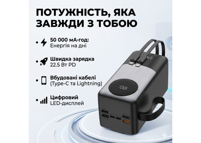 Інтегровані кабелі: Вбудовані дроти Type-C і Lightning роблять використання пристрою максимально зручним.
