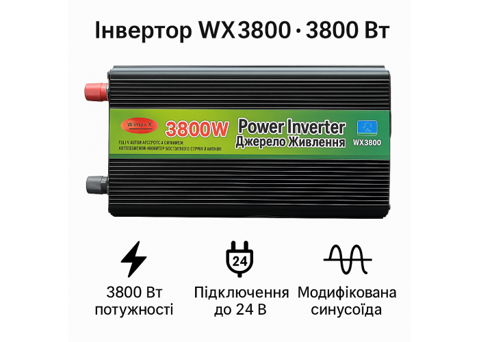 Инвертор WX3800 предназначен для преобразования постоянного напряжения 24 В в переменное 220 В и подходит для автономных систем питания, резервного электроснабжения и мобильного использования. Модель рассчитана на нагрузку до 3800 Вт и выдает напряжение с модифицированной синусоидой, что делает её оптимальным решением для большинства бытовых и силовых устройств.