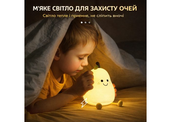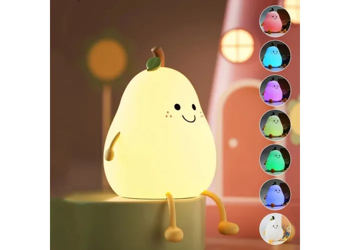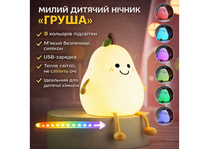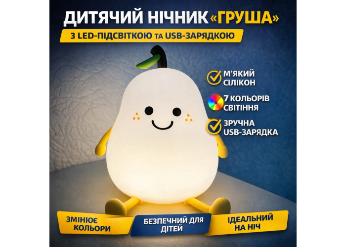 Детский ночник-светильник в форме груши — безопасный и удобный светильник для использования в детской комнате. Корпус выполнен из мягкого гипоаллергенного силикона, который не бьётся и приятен на ощупь. Светильник оснащён LED-подсветкой с 7 режимами цвета, создавая уютную атмосферу для сна, кормления или нічного догляду за ребенком. Встроенный аккумулятор заряжается через USB, что делает ночник портативным и удобным как дома, так и в дороге. Идеально подходит для малышей, благодаря мягкому, ненавязчивому свету и милому дизайну.