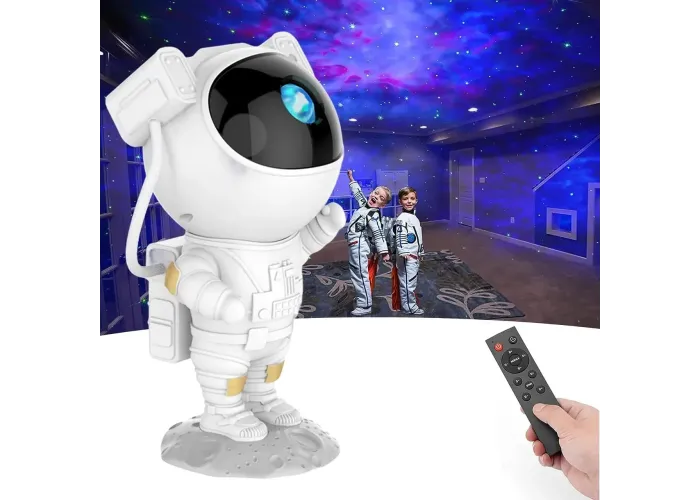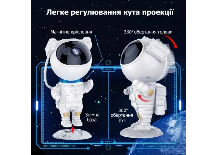 ИННОВАЦИОННЫЙ ДИЗАЙН И РЕГУЛИРУЕМЫЙ УГОЛ ПРОЕКЦИИ. Звездный проектор ночного неба выполнен в форме компактной фигурки астронавта (высота 24,5 см), облаченного в белый скафандр, а подставка имитирует поверхность Луны. Голова и тело соединены магнитной абсорбцией, поэтому голова может легко вращаться на 360°. Так как проектирующая лампа ночника Звездное небо расположена в шлеме астронавта, поворачивая голову, вы можете регулировать направление и угол самой проекции. Лунное основание съёмное, а руки космонавта подвижны чтобы принимать различные позы. Лазерный ночник проектор звездного неба отличается футуристичным дизайном, продуманным до мелочей, и станет прекрасным декоративным украшением для любого интерьера.
