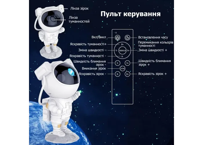 ПУЛЬТ ДИСТАНЦИОННОГО УПРАВЛЕНИЯ И ФУНКЦИЯ ТАЙМЕРА. Для максимального удобства проектор ночник Астронавт оснащен пультом дистанционного управления с диапазоном действия 5 м. С его помощью вы с легкостью можете регулировать цвет, яркость и скорость вращения туманности, частоту мигания и яркость звездного неба. Кроме того, вы можете установить таймер на 45 или 90 минут, и в этом случае звездный ночник проектор для детей автоматически выключится. Вам не понадобиться вставать с кровати, чтобы выключить его, или лишний раз заходить в детскую, рискуя разбудить ребенка.