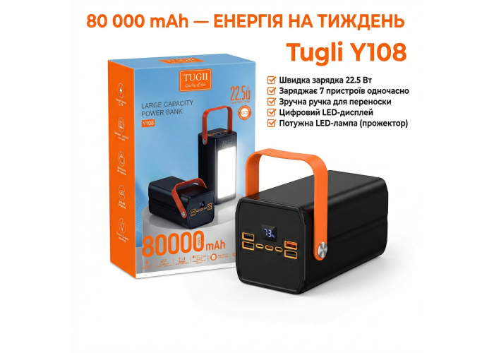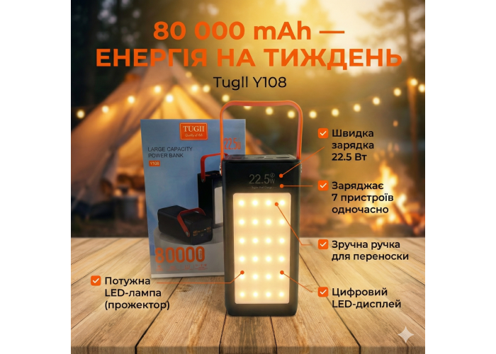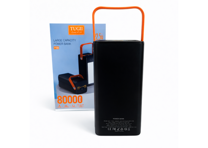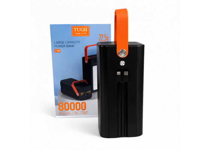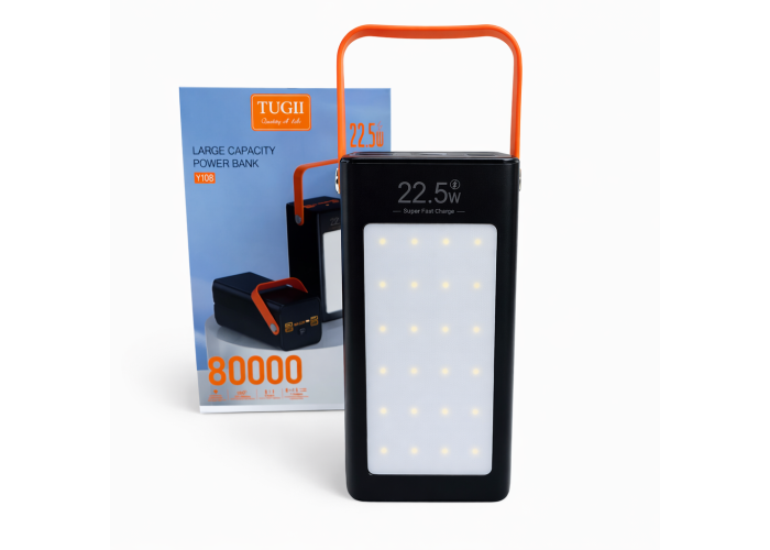 Портативный повербанк Tugii Y108 — это многофункциональный внешний аккумулятор большой ёмкости, предназначенный для автономной зарядки мобильных устройств в поездках, путешествиях и в условиях отсутствия постоянного доступа к электросети.