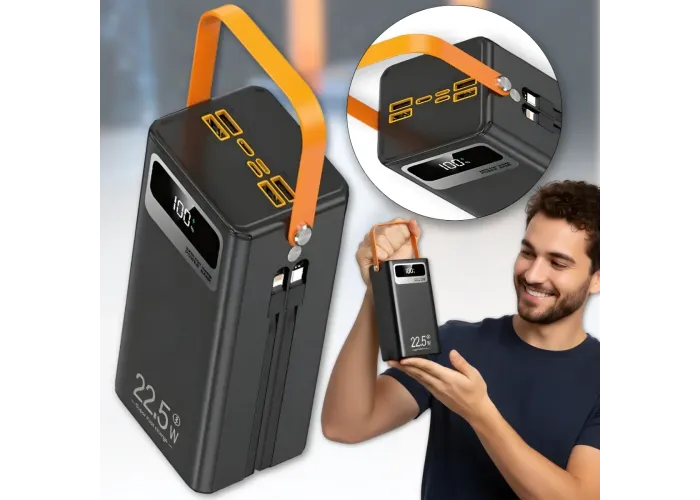 Корпус выполнен из прочного огнестойкого пластика с матовым покрытием, которое предотвращает скольжение в руке. Удобная ручка облегчает переноску, а LED-дисплей на корпусе отображает уровень заряда в процентах. Power bank оснащен несколькими выходами USB, встроенным фонариком и поддерживает современные протоколы быстрой зарядки, что делает его практичным выбором для поездок, работы и повседневного использования.
