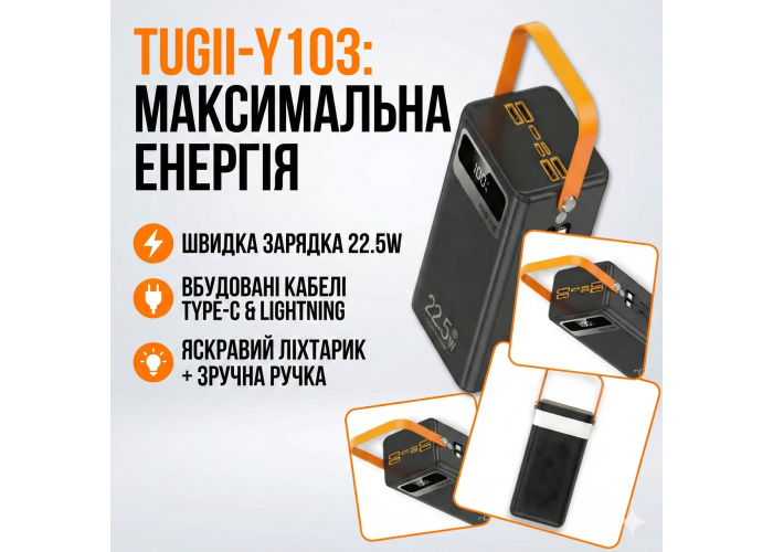 Внешний аккумулятор TUGII-Y103 - это мощное и универсальное решение для зарядки смартфонов, планшетов и других гаджетов в любых условиях. Емкость 30000 мАч позволяет многократно заряжать устройства, а поддержка быстрой зарядки мощностью до 22,5 Вт значительно экономит время. Наличие встроенных кабелей Type-C и Lightning делает использование максимально удобным, исключая необходимость носить дополнительные провода.