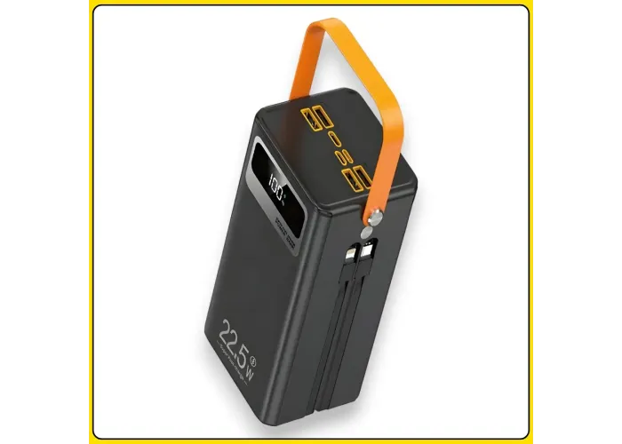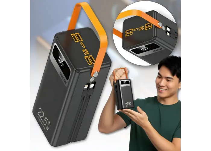 Корпус выполнен из прочного огнестойкого пластика с матовым покрытием, которое предотвращает скольжение в руке. Удобная ручка облегчает переноску, а LED-дисплей на корпусе отображает уровень заряда в процентах. Power bank оснащен несколькими выходами USB, встроенным фонариком и поддерживает современные протоколы быстрой зарядки, что делает его практичным выбором для поездок, работы и повседневного использования.