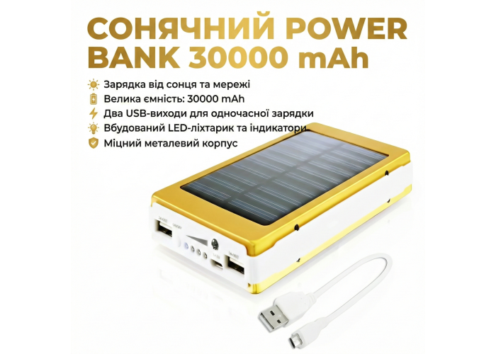 Наружный аккумулятор Solar Power Bank 30000mAh предназначен для зарядки портативных устройств, способен 0 В, но и от солнечных лучей, любого источника света и устройств имеют USB-порт. Встраиваемая солнечная батарея позволит Вам зарядить его практически в любом месте. А также противоударный и пыле-влагозащищенный корпус позволит брать его в походы и на пикники, не опасаясь о том, что его можно разбить или намочить и остаться без источника подзарядки.