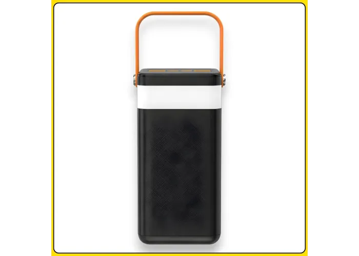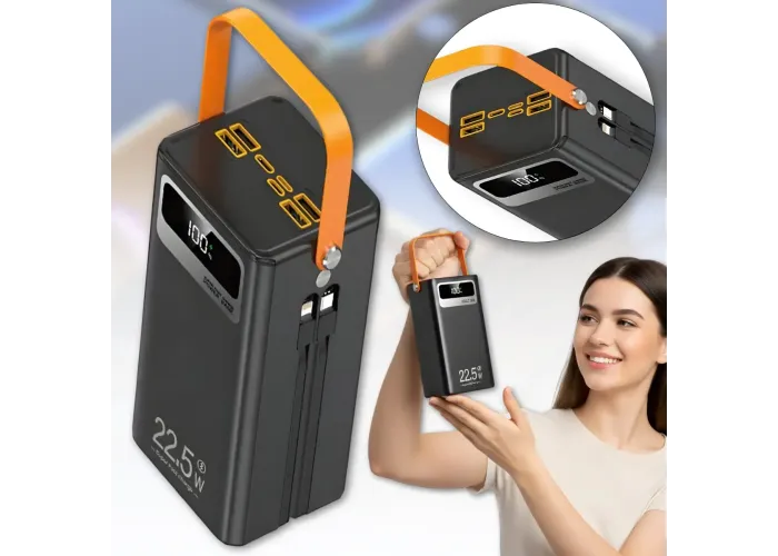 Корпус выполнен из прочного огнестойкого пластика с матовым покрытием, которое предотвращает скольжение в руке. Удобная ручка облегчает переноску, а LED-дисплей на корпусе отображает уровень заряда в процентах. Power bank оснащен несколькими выходами USB, встроенным фонариком и поддерживает современные протоколы быстрой зарядки, что делает его практичным выбором для поездок, работы и повседневного использования.