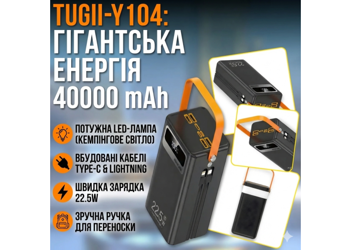 Внешний аккумулятор TUGII-Y104 - это мощное и универсальное решение для зарядки смартфонов, планшетов и других гаджетов в любых условиях. Емкость 40000 мАч позволяет многократно заряжать устройства, а поддержка быстрой зарядки мощностью до 22,5 Вт значительно экономит время. Наличие встроенных кабелей Type-C и Lightning делает использование максимально удобным, исключая необходимость носить дополнительные провода.