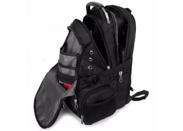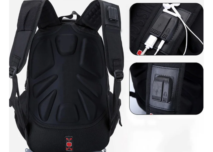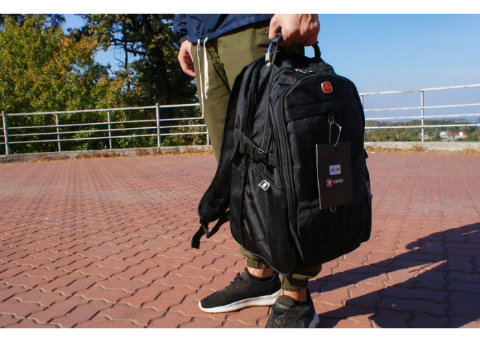 Данная модель идеально подходит как для туризма активного отдыха, так и для городских условий и также очень хороший выбор для школьников у данной модели хорошая твёрдая ортопедическая спинка. Эта модель оснащена специальными аудио удлинителями и USB, что позволяет оставить ваш телефон и Power Bank в кармане рюкзака. В рюкзаке Swiss Bag имеются отделение-органайзер и отделение для ноутбука, которое позволяет сохранно переносить компьютер диагональю до 15.6 дюймов. Материал из которого изготовлен рюкзак (полиэстер+нейлон) обладает износостойкими характеристиками и не боится влаги. Ручка для переноски усилена стальным тросом для большей надёжности. Дышащая ортопедическая спинка с системой вентиляции “Airflow” – система комфорта спины Airflow обеспечивает циркуляцию воздуха для максимального удобства. Максимальный объем вещей, которые можно поместить примерно 40 литров.