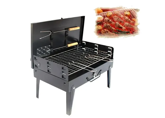 У складеному вигляді мангал перетворюється на компактний кейс із ручкою, що зручно для зберігання і транспортування. Бічні вентиляційні отвори забезпечують рівномірне згоряння вугілля, а регульована решітка дає змогу контролювати ступінь просмаження.