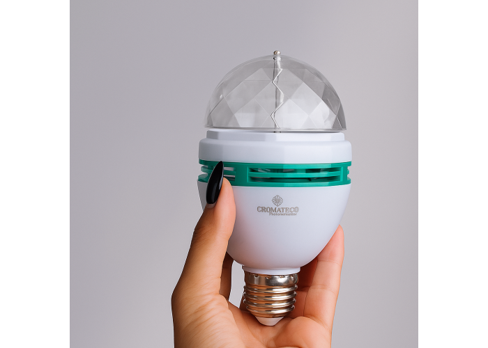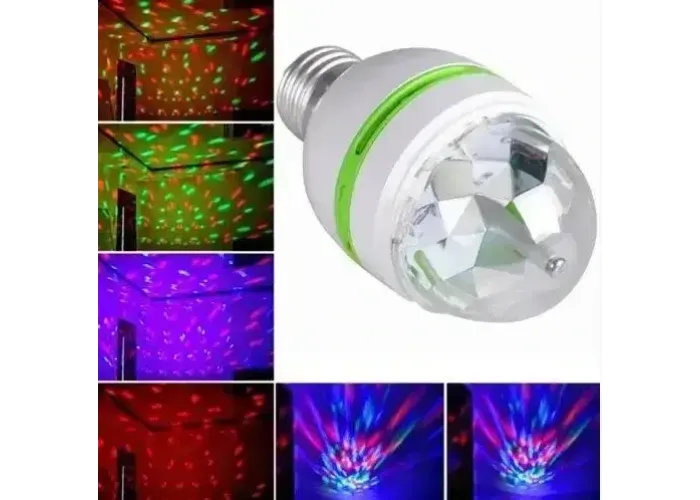 Її можна встановити в люстрах, нічниках, торшерах, настільних лампах. Це не становить труднощів. під час увімкнення дисколампи загоряються світлодіоди та колба обертається навколо своєї осі.