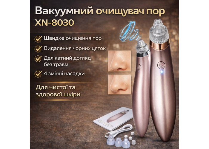 Вакуумний очисник шкіри Beauty Skin Care Specialist XN-8030 призначений для швидкого та зручного очищення пор, видалення закупорок сальних залоз, вугрової висипки, акне за максимально дбайливого поводження зі шкірою.