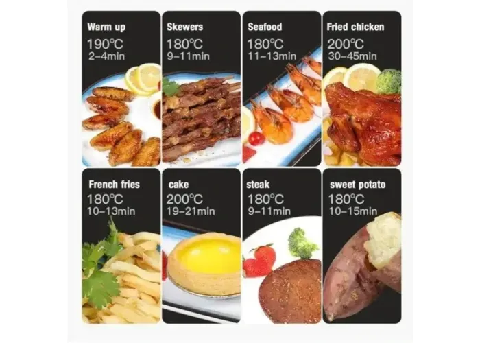 Високошвидкісна технологія циркуляції повітря на 360°, яка може швидко нагріти та варити продукти без додавання соняшникової олії для приготування їжі.