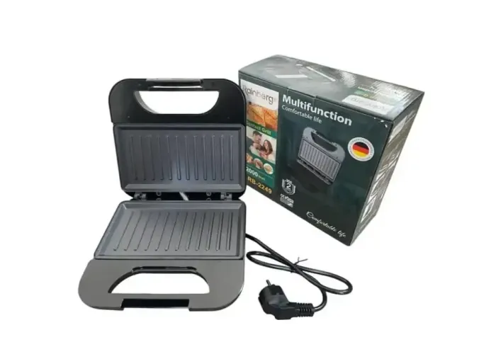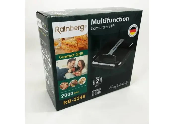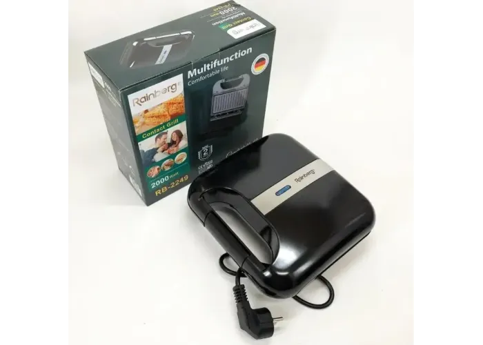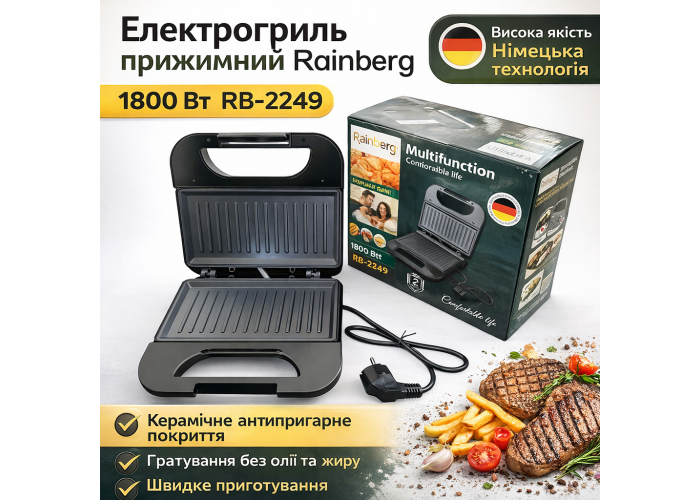 Електричний Гриль чудово підходить для готування гарячих сендвічів, паніні. Можна смажити або розігрівати стейки, сосиски, овочі та вигадувати свої рецепти. Бутерброди, можливо, і є найпростішим рішенням для видалення голоду. І щоб зробити сендвіч смачний і швидкий, знадобиться Rainberg RB-2249. Ребристі пластини покриті антипригарним матеріалом, що робить їжу здоровою та легкою. Спокійно можна готувати без олії та жиру! Чудові результати в приготуванні також виходять із використанням паперу для випікання. Гриль обладнаний нагрівальними лампами, які дають зрозуміти, що прилад «готовий до використання» і щоб попередити, коли пластини гарячі. Не переживайте все зручно закривається й безпечна у використанні.