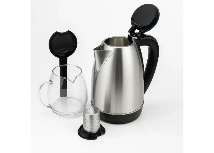 Електрочайник впевнено посідає важливе місце в нашому побуті. Розв'язуючий фактор — зручність у використанні та швидкість закипання води. Електрочайник є екологічно чистим, ударостійким, зі зручним в обслуговуванні матеріалом, покриття нагрівального елемента — неіржавка сталь. Особливістю комплекту є підставка та заварник, у якому ви зможете не відходячи від місця заварити свій улюблений чай.