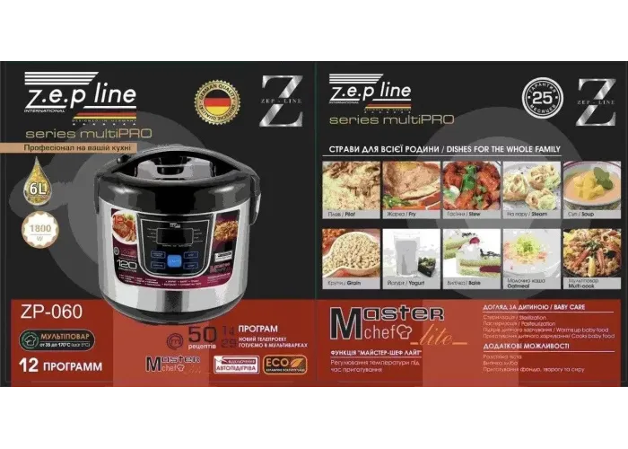 Мультиварка Zep-Line ZP-060 дає змогу варити, смажити, піч, тушкувати, готувати на парі та у фритюрі, підігрівати вже приготовані страви, підтримувати гарячу страву тривалий час, водночас не вимагаючи постійного контролю.