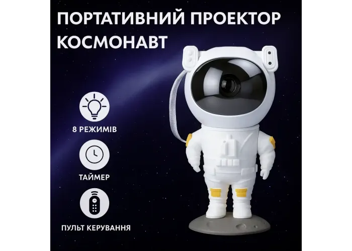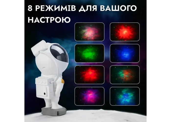 Проєктор-нічник "Космонавт" з пультом дистанційного керування пропонує вам унікальний спосіб створити чарівну атмосферу в кімнаті. Завдяки його дивовижній функціональності, ви зможете перенестися в неймовірний космічний світ прямо у вашому власному будинку. Цей пристрій працює у 8 різних режимах, даючи змогу вам вибрати ту, яка найбільше вам подобається або відповідає вашому настрою.