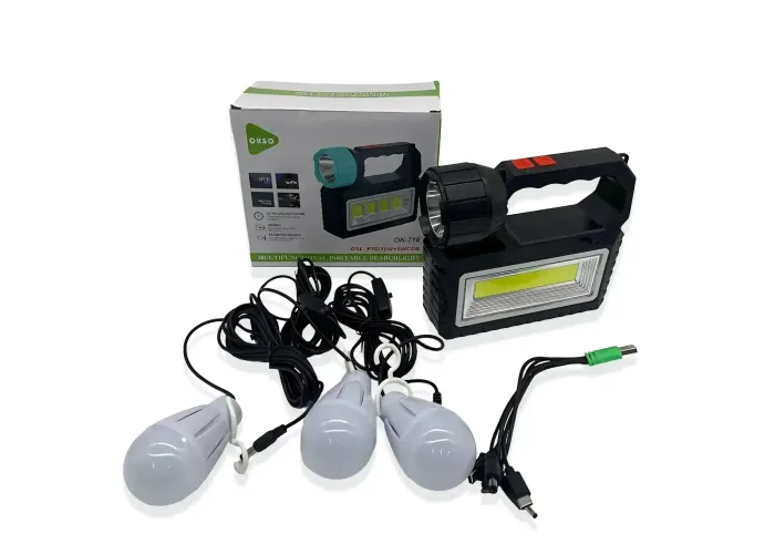 Сонячна зарядна станція OK-718S-A з LED+COB ліхтарем 10 Вт, PowerBank, сонячна панель, 3 виносні лампи, акумуляторна ручна лампа 174 мм