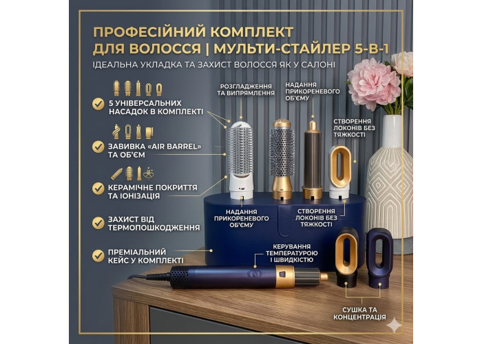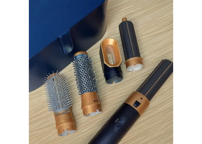 • 5 насадок у комплекті — для сушіння, випрямлення, завивання, надання об'єму та укладки.