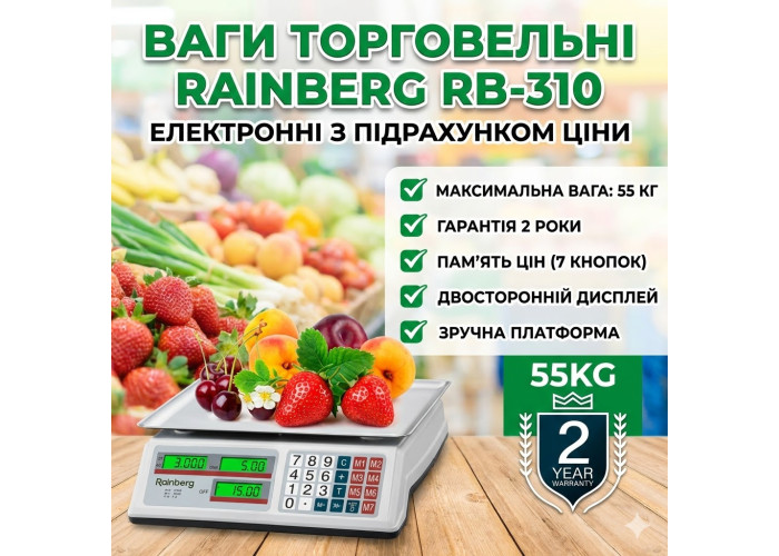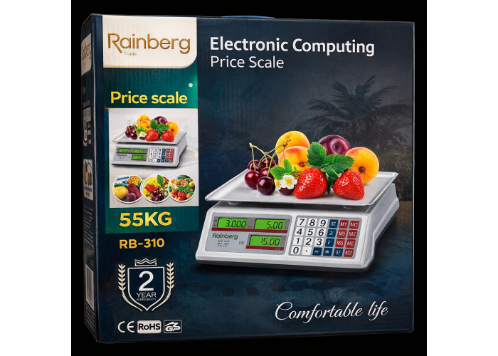Торгові електронні ваги Rainberg RB-310 — це надійне та зручне рішення для торгівлі на ринку, у магазині, на складі або під час виїзної торгівлі. Ваги обладнані функцією підрахунку вартості товару, що неабияк прискорює процес обслуговування покупців.