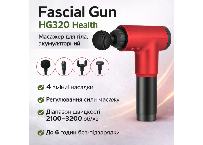 Fascial Gun HG320 Health - портативный аккумуляторный вибромассажер в форме пистолета для домашнего использования. Компактный корпус и сменные насадки позволяют удобно использовать устройство для разных групп мышц.